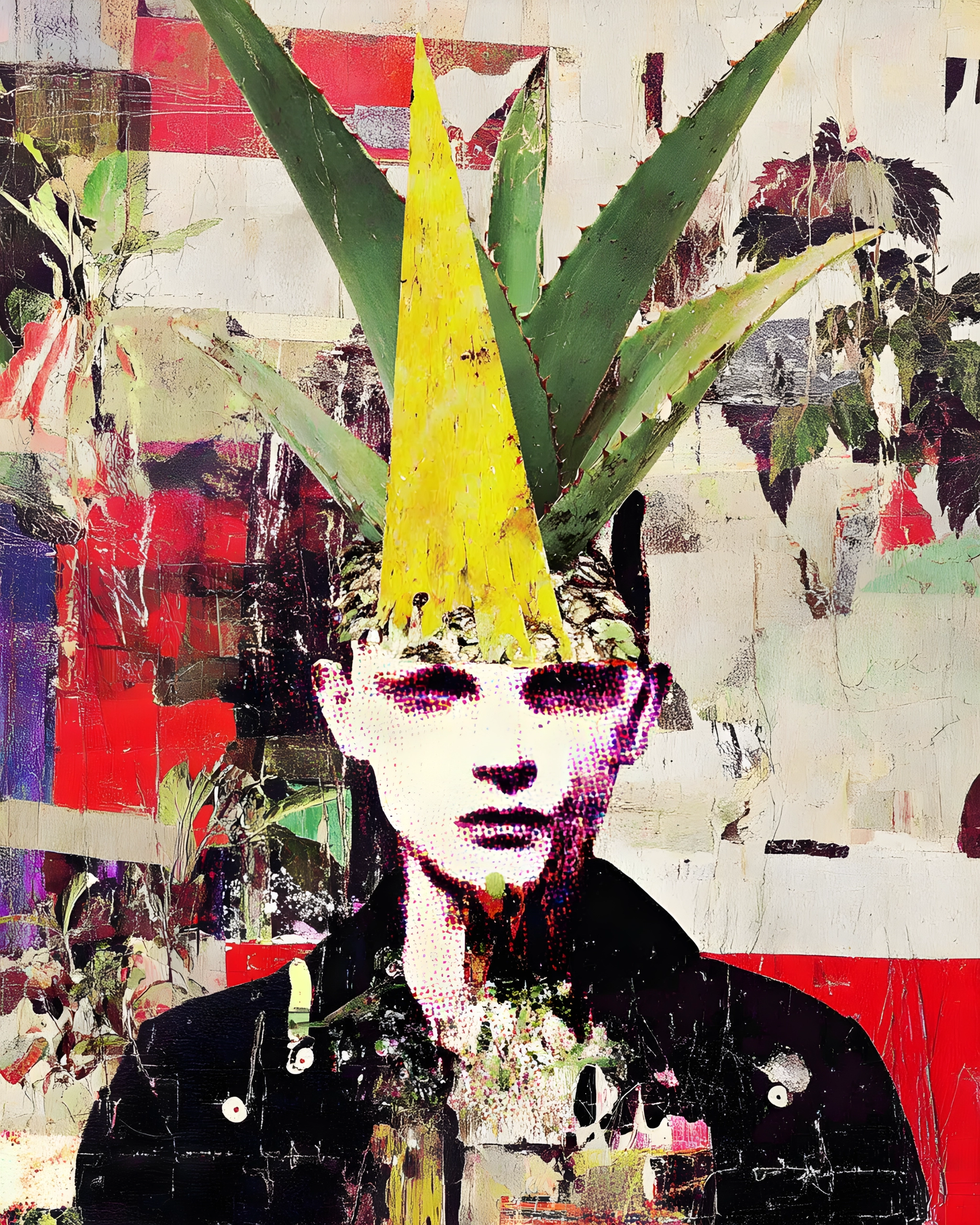 He showed up to the closing-night show wearing a jacket that still smelled like rain and spraypaint, and on his head a crown made from the hard green leaves he’d stolen off a rooftop plant. Nobody asked why, not out loud anyway. The city had been chewing him up for months, billboards peeled over billboards, old posters fighting to stay seen, and he’d started to feel like just another layer. So he made himself into something you couldn’t ignore: a bright yellow spear splitting the noise, leaves flaring like warning signs. He said the plant taught him how to survive—hold water when you can, grow sharp when you have to. Later, when the gallery emptied and the music died, he left the crown behind on the floor, like he’d finally put down a role he was tired of playing, but the walls kept his stare, cracked and loud, forever refusing to fade.