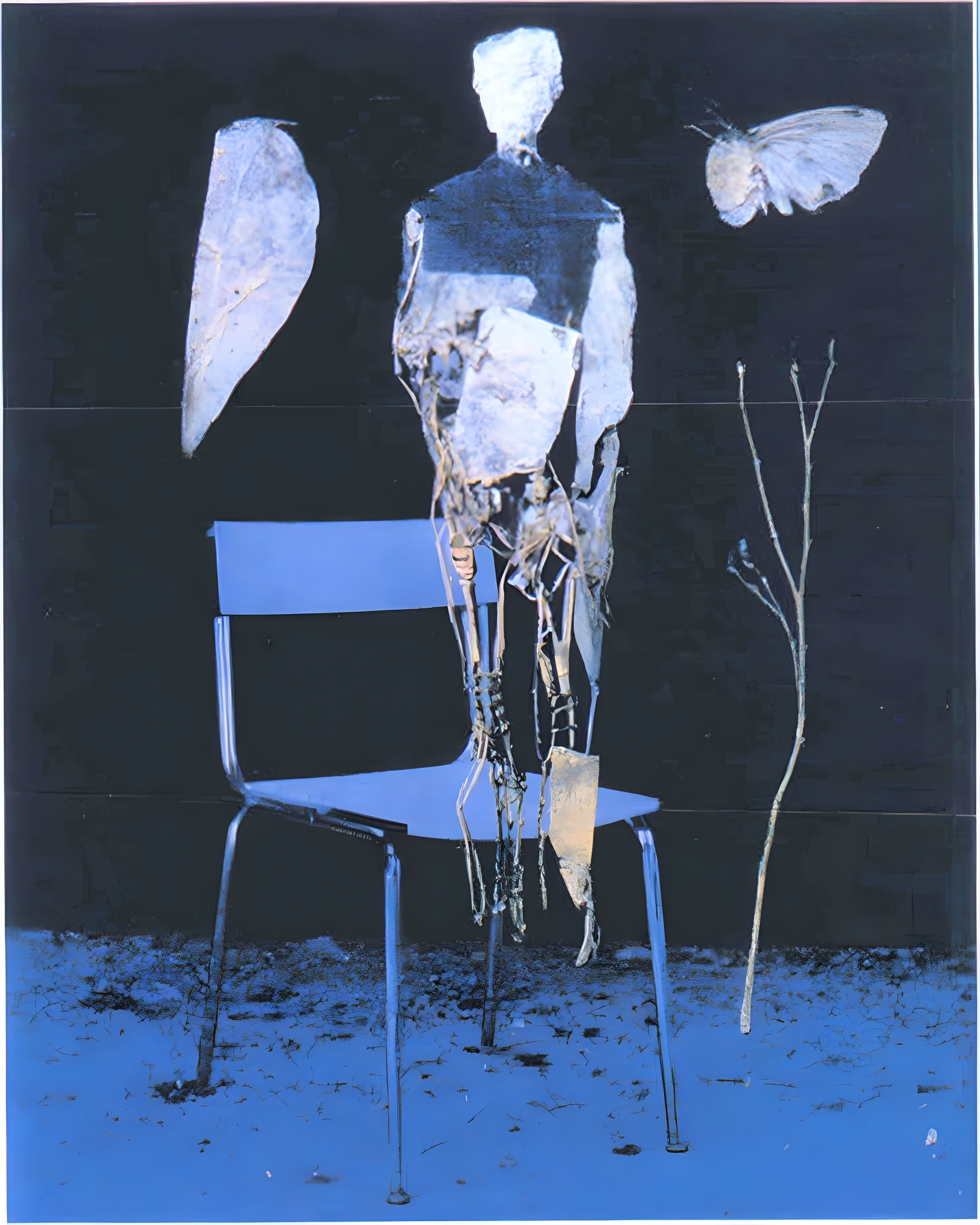 He never sat in the chair, not really. The chair was for the living, and he’d already started turning into something quieter, stitched together from scraps and old paper like a note nobody mailed. Every night he stood behind it, facing the dark as if it might answer back, while two pale moths circled him like drifting thoughts that couldnt land. People said he used to be a teacher, the kind who stayed late to erase the board twice, but after the factory closed he stopped speaking and began collecting things the street forgot: torn envelopes, twine, brittle leaves. He built himself a body from them, hoping the missing parts would come back if he looked patient enough. The little bare branches beside him are the only witnesses, thin as whispers, and when the moths finally hover near his shoulder it feels like a lesson ending softly, with no applause, just the gentle understanding that some goodbyes take years to say.
