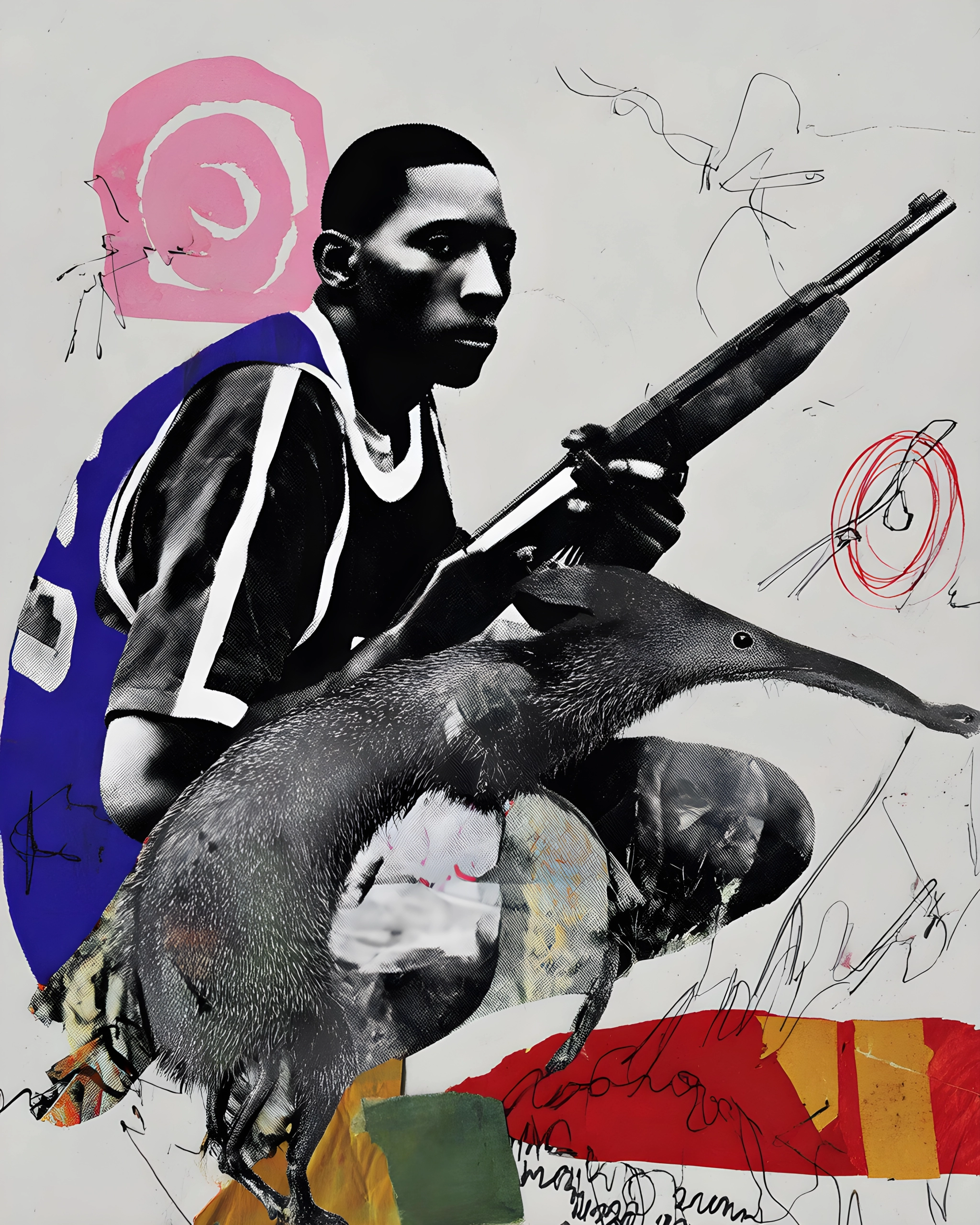 He was always told to keep his head down, but the city never let him. In the torn-up poster layers and busted paint, he learned to read signs like they were weather. That night he crouched in a half-lit stairwell, holding a borrowed rifle that felt too heavy for his hands, listening to the distant pop of trouble rolling closer. Then the antbear slipped into the frame like it belonged there, impossibly calm, snout sweeping the air as if hunting for sweetness in all this grit. Folks said it was a bad omen, but he saw it different: a creature built to survive on crumbs, on what nobody else wants. The pink spiral behind him was the last kind thing he remembered, his sister drawing roses on scrap paper, swearing they’d get out. He didn’t fire a shot. He just watched the antbear pass, and for one shaky second he believed there was another way, even if he couldnt spell it out yet.
