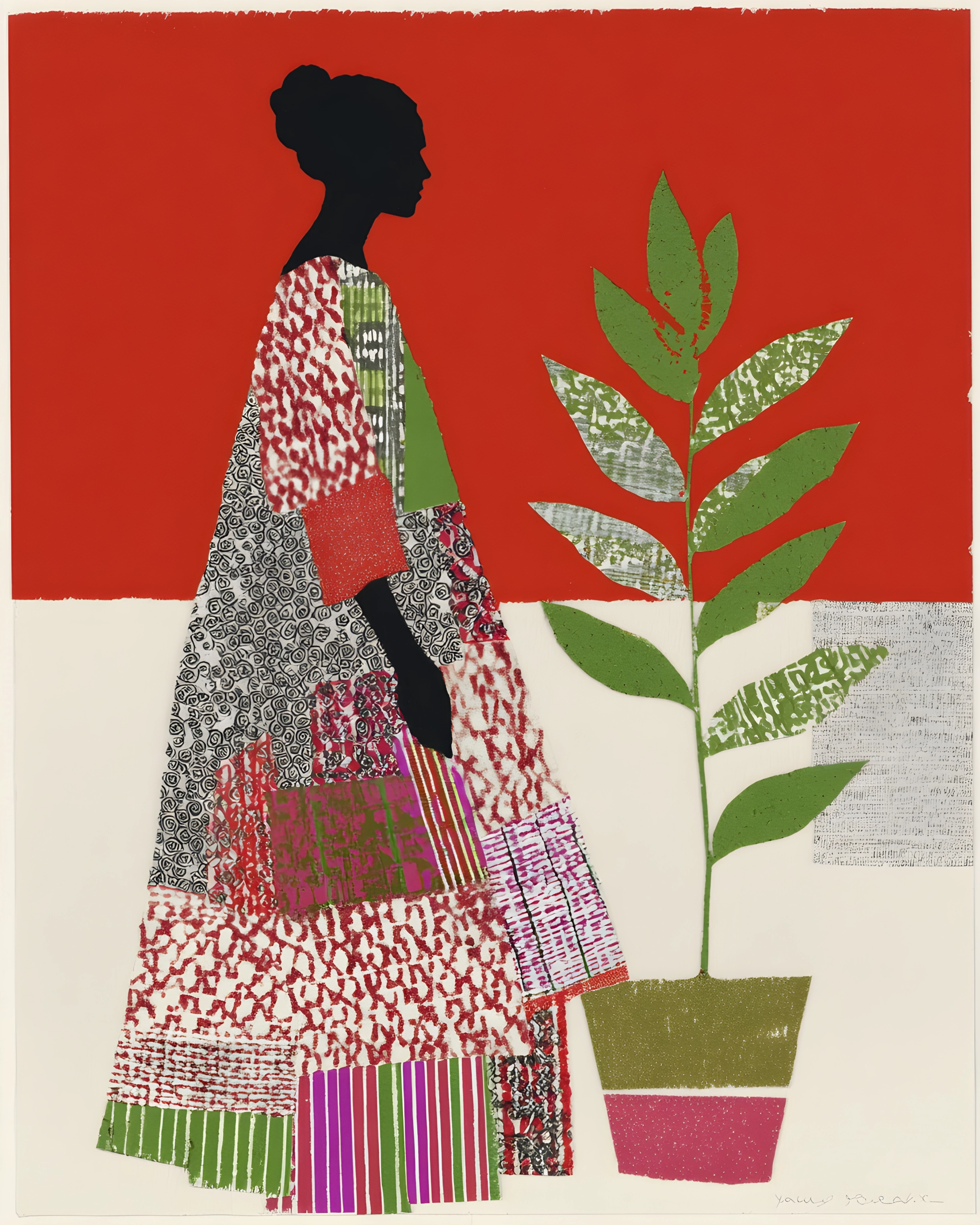 She used to borrow scraps from the tailor’s floor, tiny offcuts nobody wanted, and stitch them into a dress that didn’t match on purpose. The day the room turned that loud red, she stood still beside the potted plant she’d been nursing like a secret, counting new leaves the way other people count good luck. Each panel of fabric held a memory she couldn’t say out loud: a market stall bargain, a worn tablecloth from her aunt, a curtain faded by summer, even a bit of ribbon from a letter she never sent. She wasn’t waiting for anyone to notice her, not really, but she kept walking past the plant anyway, as if her footsteps could convince it to keep growing. And somehow it did, slow and stubborn, like her.