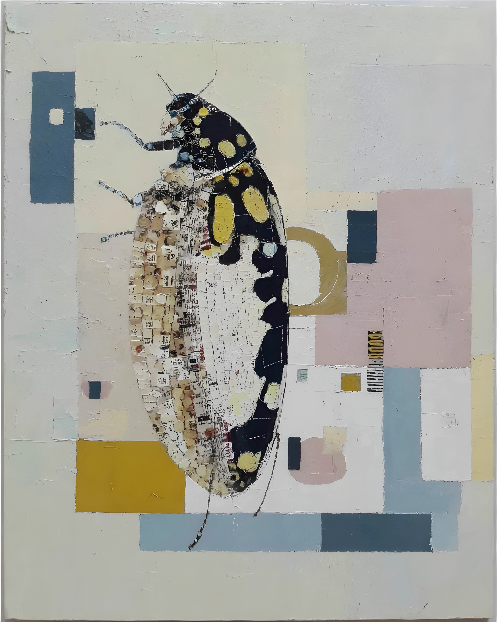I found the beetle the day the old library shut its doors for good, when pages were being tossed like they didnt matter anymore. I slipped a handful into my pocket, not even sure why, and later I tore them into small tiles and pressed them into its belly like a quiet armor. The black shell with those soft yellow spots came from a memory of summer nights on a porch light, when everything felt bigger and kinder. Around it I painted blocky rooms of pale blue, dusty pink, and tired cream, like the little city squares we walk through without noticing. The beetle stands there anyway, stitched from scraps, carrying the last bits of stories on its back, stubborn and calm, as if it knows where all the lost words went.