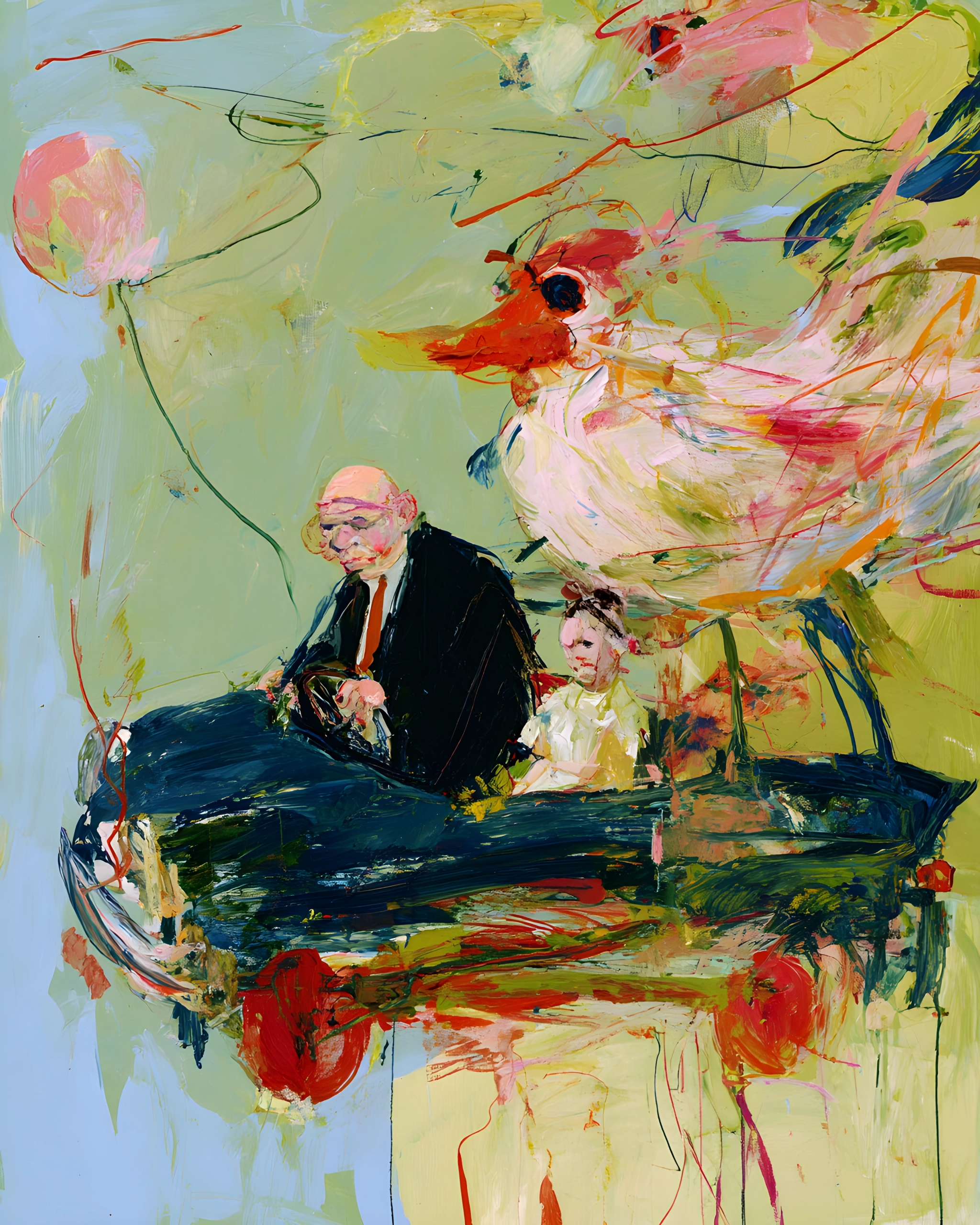 Grandad said the car still ran fine, even if the wheels were more like red buttons and the road had gone missing years ago. He kept both hands on the steering wheel anyway, serious as a judge, while I sat beside him pretending not to be scared of the sky-green emptiness all around us. Then the giant bird leaned in from the right, feathers smeared with pink and sunlight, its beak pointing forward like it knew the way better than any map. Grandad whispered that the bird used to visit him when he was a boy, back when he could still hear the river talk at night, and that if you followed it you’d end up where lost things go. We drifted past a pale balloon and scraps of color that looked like old arguements left unfinished, and I swear the bird blinked at me like it recognised my face. I wanted to ask where we were headed, but the answer felt too big for words, so I just held on and let the painty wind carry us.