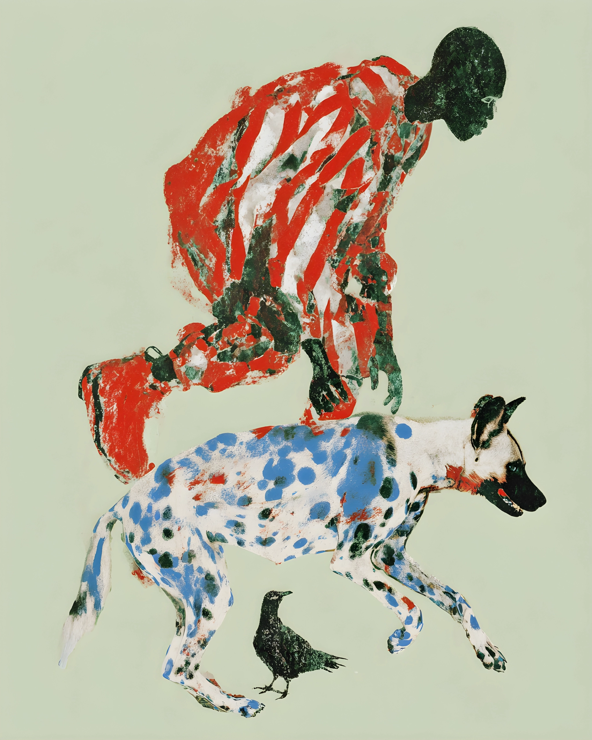He was always late, even when there was nowhere left to go. In the picture he’s caught mid-stride, bent forward like the wind is pulling him by the ribs, his red-striped coat flapping like a warning flag. The spotted dog runs ahead, not scared, just certain, as if it knows the route better than any map. A small black bird keeps pace under their legs, a stubborn little witness that refuses to be shaken off. People in the old neighborhood used to say the man ran to outrun his own name, and the dog ran because it had once been left behind and swore never again. On the day this was painted, the sky was the color of weak tea and the city was quiet in that uneasy way, and someone watching from a doorway thought, for a second, that the three of them were the same story told in different bodies. If you look close, you can almost hear it: shoes scraping, paws drumming, wings trying not to panic.