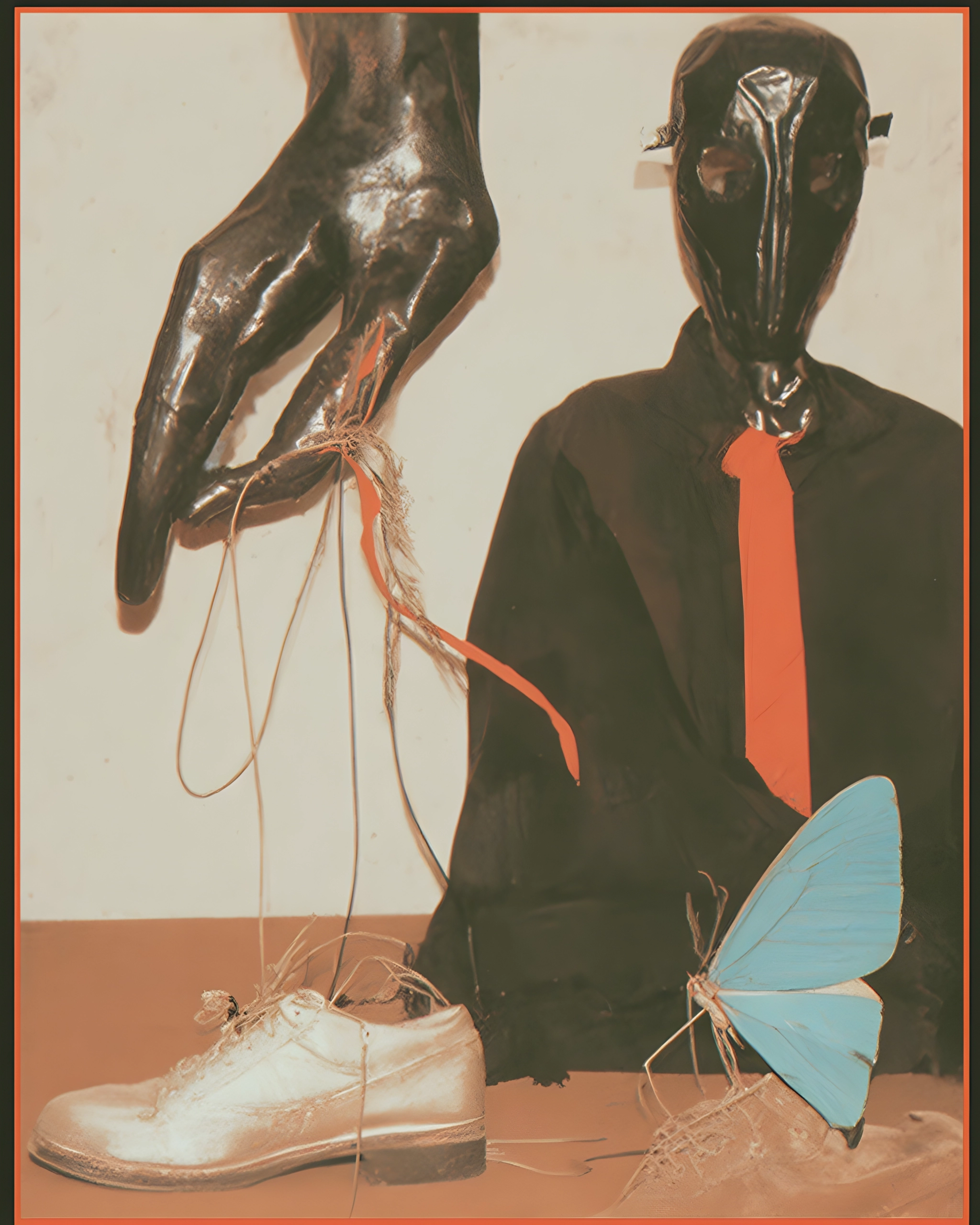 He showed up to the interview dressed like a shadow in a pressed shirt and a too-bright red tie, but nobody could quite remmember his name. The mask wasn’t for drama, he said, it was for keeping promises. Above him, a gloved hand dangled thin strings like old nerves, tugging at his shoelaces and wrists, making him take one step forward and three back, every time the boss called. He kept a small blue wing pinned near his ankle, a bit of sky he’d found in a gutter on a rainy morning, and he swore it was the only thing that still belonged to him. Some days he’d feel it flutter, just once, and he’d think he could cut the threads and walk out clean. But the hand always waited, patient as gravity, and the room stayed quiet, as if silence itself was part of the contract.